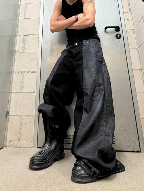 Spodnie z szerokimi nogawkami w kolorze czarnym, woskowanym – ręcznie robione, w stylu grunge Y2K, luźne, rozkloszowane dżinsy, alternatywa dla streetwearu -